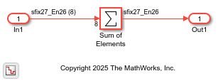 To optimize the adder mapping to a DSP48E2 slice, the model sets Inport block signal width is 27 bits or less. The Sum of Elements block uses these parameter settings: