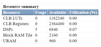 After synthesis and implementation, you can view the Resource Summary section in the Result pane. This resource summary table shows the number of adders that the tool maps to DSP slices. In this example, the synthesis tool uses five DSP slices.