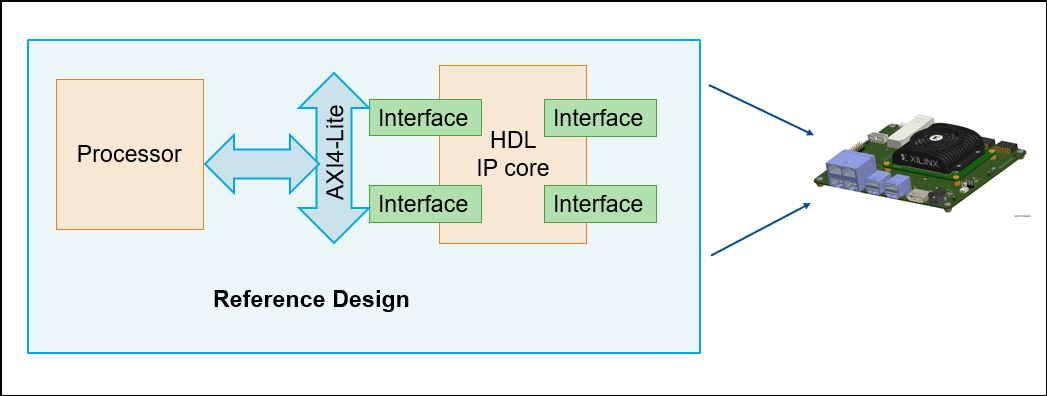 The exported Tcl script contains the custom reference design. You use the Tcl script to recreate the block design and integrate the HDL IP core with the block design in a Xilinx Vivado project.