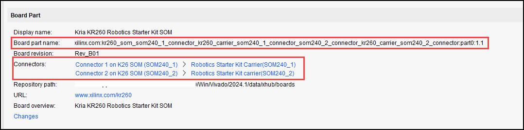 1. Open Xilinx Vivado and create an RTL project by adding the necessary source files and the constraint files. In the board selection step, click the Boards tab and select AMD Kria KR260 Robotics Starter Kit SOM as the target device. If you want to add the companion card and manage the connections to the SOM, click the Connections option as shown below.