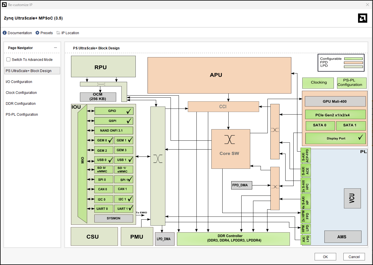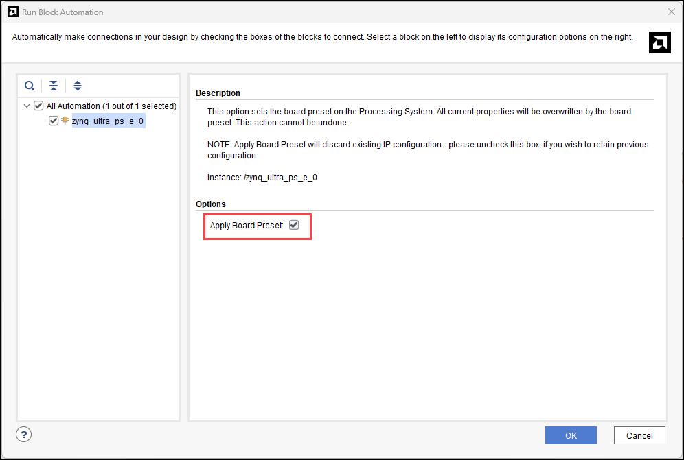 3. To set the board preset on the PS for Kria KR260 Robotics Starter Kit, select the Apply Board Preset check box. After applying the board preset, the block design marks the MIO peripherals according to the board definition.