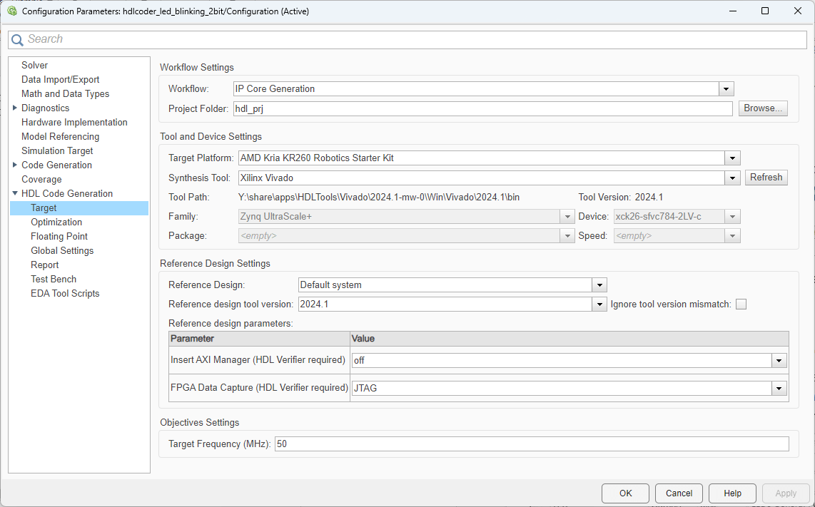 4. In the Apps tab, click HDL Coder. To open the Configuration Parameters dialog box, in the HDL Code tab, click Settings. In the HDL Code Generation > Target pane, set:
