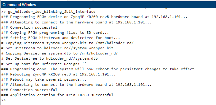 When you run this script, HDL Coder creates an application with the name mw_hdlcoder_K26 on the target and loads the design to the FPGA. When you run the script, the user-defined LEDs, F8 and E8, blink on the KR260 kit.