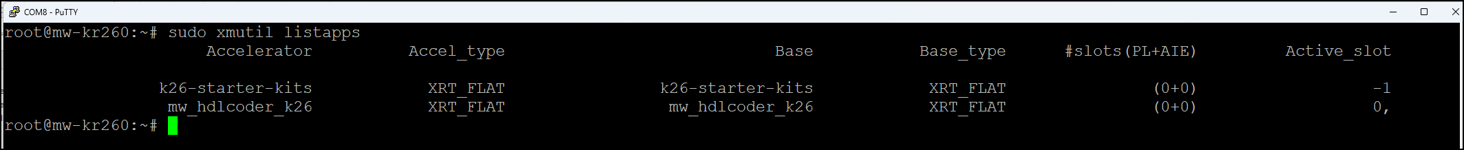 5. Initially, the board uses the factory-provided BIN file to boot up. After the board boots, run this command at Linux terminal of the board to load the provided MathWorks BOOT.BIN file. For more information on opening the Linux terminal on the target, see Command Line Session with AMD SoC Devices (Embedded Coder).