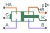 The figure shows the key components of the actuator. Ports A and B represent the moist air chamber inlets. Port R represents the translating actuator piston and port C represents the actuator case. Ports HA and HB represent the thermal interfaces between each moist air chamber and the environment. The moving piston is adiabatic.