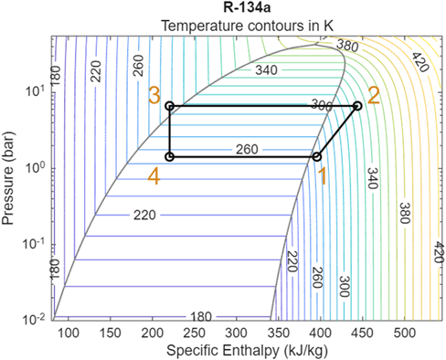 These points define the thermodynamic cycle. For more information about how you select these four points, see Model a Refrigeration Cycle. Use the enthalpy values at these points to calculate the coefficient of performance (COP),
