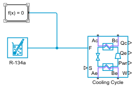 T_environment + dT_subcooling + 5and Nominal evaporating (saturation) temperature toT_set - dT_superheat - 5.Connect the Two-Phase Fluid Predefined Properties (2P) block to port F of the System-Level Refrigeration Cycle (2P) block.
