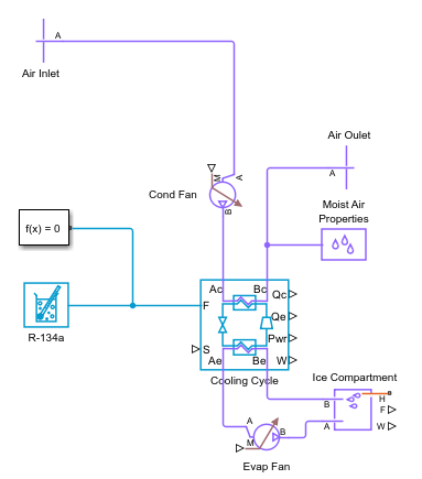 This example shows how to model an ice maker in Simscape™ by designing a custom block that uses mode charts to represent freezing water in the machine. You create a model that represents the refrigeration cycle and the ice compartment. Then, you create a custom Simscape block that uses a mode chart to model the states of the water, from liquid to solid. For more information about mode charts, see Mode Chart Modeling.
