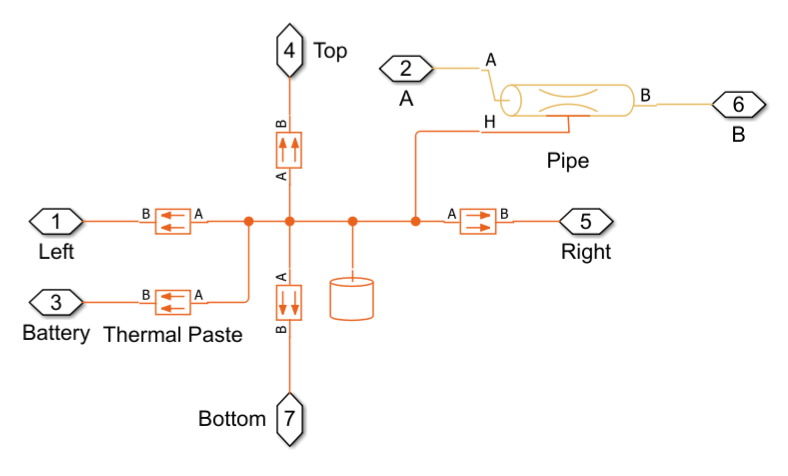 Each element consists of a Thermal Mass block and a Pipe (TL) block. Conductive Heat Transfer blocks model heat transfer from each element to neighboring elements and the battery.