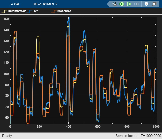 However, note that the training and validation has been performed on the downsampled datasets. If your application requires running the model at the original rate of 10 Hz, you can do so in Simulink® by using the rate transition blocks at the input/output ports of the Hammerstein-Wiener Model block.