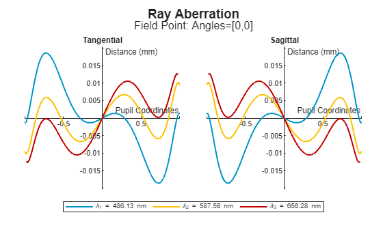 Tangential and sagittal ray aberration values, returned as a RayAberration object. The distance between the tangential and sagittal foci points along the optical axis represents the longitudinal astigmatism.
