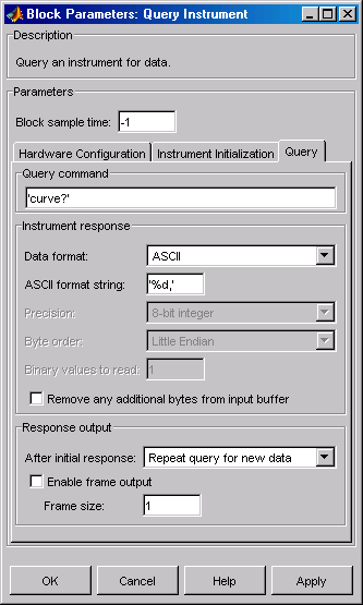 The Query tab is where you define the optional query command, set the format for the response, and define what the block does after the initial instrument response.