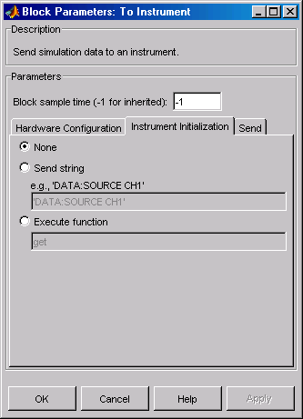 The To Instrument block configures and opens an interface to an instrument, initializes the instrument, and sends data to the instrument. The configuration and initialization happen at the start of the model execution. The block sends data to the instrument during model run time.