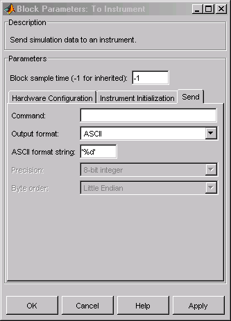 This is the command that is sent to the instrument with the Simulink data. This command is optional—if you leave this field blank, the Simulink data is sent to the instrument without any prefix or additional formatting.