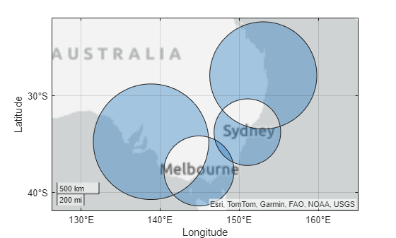 • The second vector contains polygon shapes that buffer the cities of Melbourne and Sydney.