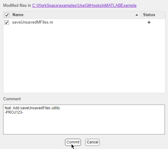localrepo = gitrepo(path/to/repo/folder) commit(localrepo, Message="Add saveUnsavedFiles utility"); Error using matlab.git.GitRepository/commit>i_doCommit The 'commit-msg' hook aborted the operation. Caused by: ERROR: Commit message does not start with 'fix:', 'feat:', 'doc:', or 'test:'