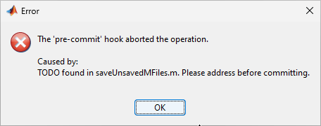 In this example, the saveUnsavedMFiles.m file contains "TODO" comments. When you attempt to commit your changes, the commit operation throws the error you specify in the pre-commit hook.