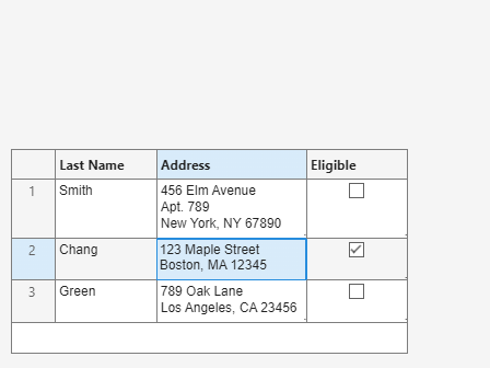 Contiguous selection of multiple cells — A 2-by-2 matrix specifying the boundaries of the block of cells to choose. Each matrix row corresponds to the row and column indices of a cell. The app testing framework performs a choose gesture on the specified cells as well as all cells between them.