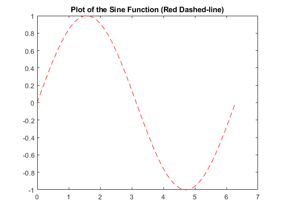 figure plot(x, y, 'r--') title('Plot of the Sine Function (Red Dashed-line)')