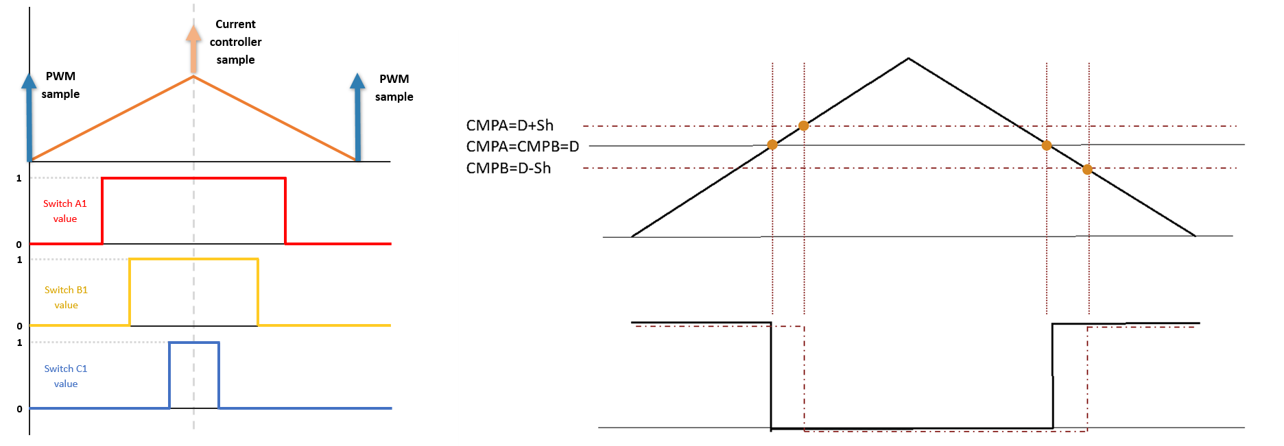 To achieve a dynamic phase shift in the PWM pulses, two compare registers can be used for each of the three phases, as shown in the below figure.