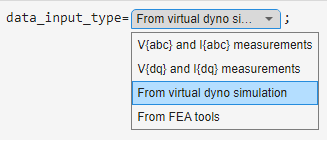V{abc} and I{abc} measurements: This option uses the physical measurements in the stationary (a - b) frame. When you select the corresponding option, the script calculates the corresponding values of voltage, current and flux linkages in the rotor (d-q) frame from the provided motor position using Clarke and Park transforms.V{dq} and I{dq} measurements: This option uses physical measurements in the rotor (d-q) frame.From virtual dyno simulation: This option uses the FEA based virtual dyno simulation. Select this option if you do not have pre-existing data to import. This script loads data from the pmsmData_LdLq.mat and DynoData.mat data files that are provided with this example.The model that was used to obtain DynoData.mat is also provided with this example (VirtualDynoModel.slx). You can modify this model to obtain another data file according to your motor specifications.