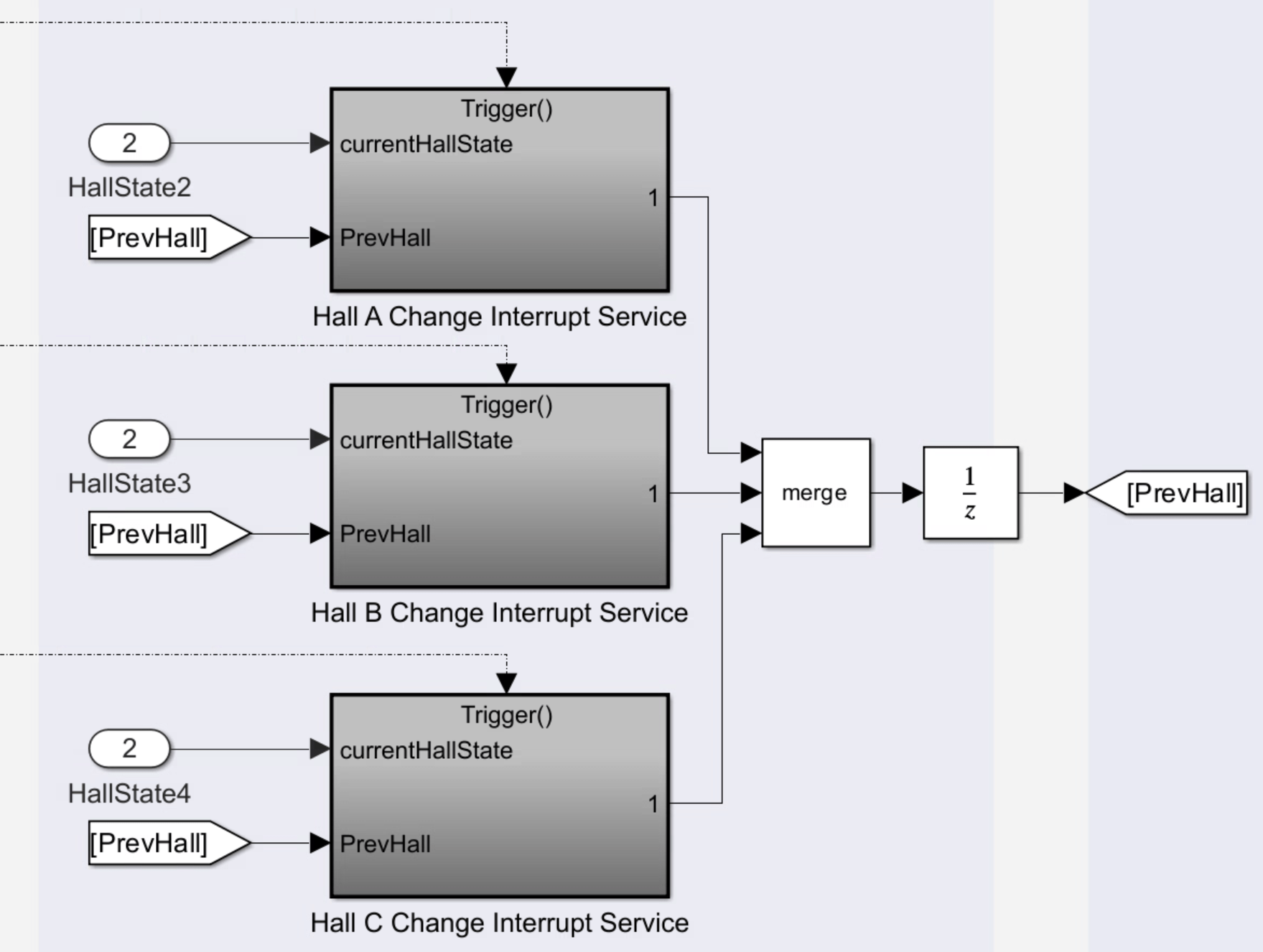 Refer to the example model to understand how to integrate the generated code with your custom code. For instance, the models with three ISRs employ data stores (implemented as global variables in the generated code) to interface among the Hall Speed and Position block and the three Hall Validity blocks. Since each Hall Change Interrupt Service subsystem contains an instance of HallValidityCodegen, you can call the same entry point functions for all three ISRs.