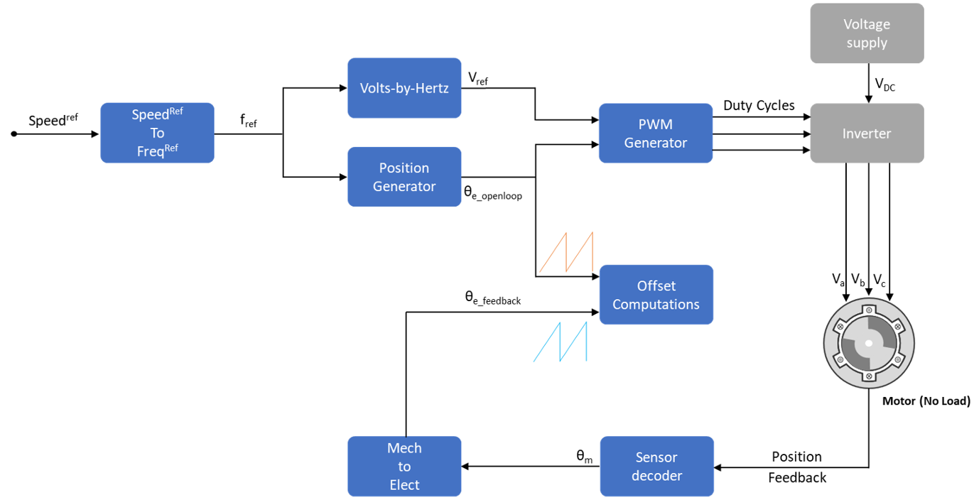 The offset computation examples in Motor Control Blockset™ use a unique algorithm along with open-loop control to compute the position offsets of the position sensors (Hall or quadrature encoder). Open-loop control (also known as scalar control or volt/Hz control) is a popular motor control technique that can be used to run any AC motor. This is a simple technique that does not need any feedback from the motor. To ensure a constant stator magnetic flux, keep the supply voltage amplitude proportional to its frequency. This figure shows an overview of the open-loop control. See Open-Loop and Closed-Loop Motor Control Techniques for more details.