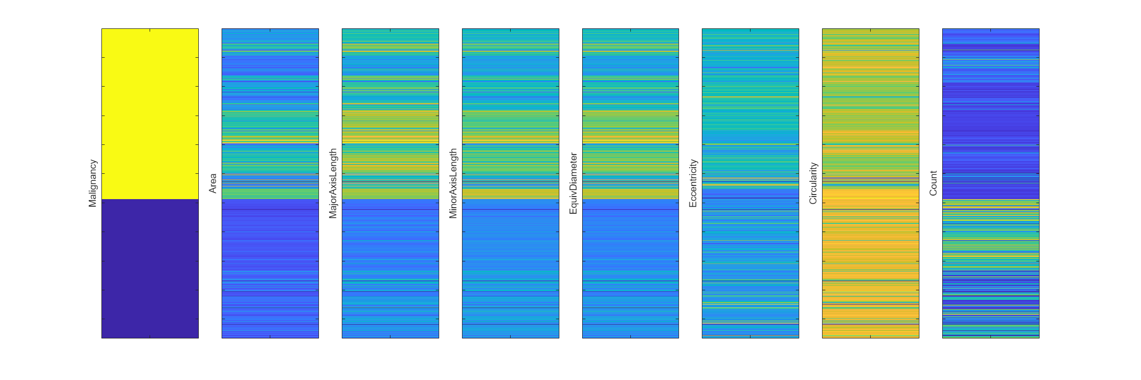 • For each nucleus, calculates the centroid, area, major axis length, minor axis length, equivalent diameter, eccentricity, and circularity by using the regionprops function. The parameters used in this example were selected based on visual differences between normal and tumor cells, and represent a subset of potential pathomics biomarkers to explore.