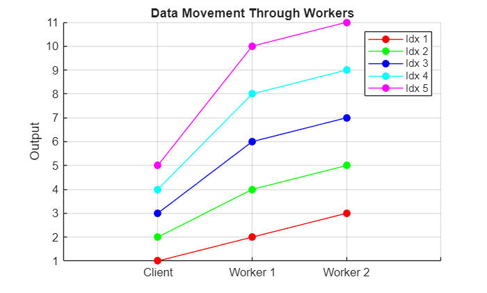 function plotWorkerOutput(inData,finalResults) c = ["r","g","b","c","m"]; figure; hold on; for idx = 1:numel(inData) plot([1, 2, 3],[inData(idx),finalResults(idx,1),finalResults(idx,2)],"-o"+c(idx),MarkerFaceColor=c(idx),DisplayName="Idx "+num2str(idx)); end hold off; ylabel("Output"); xticklabels(["","Client","Worker 1","Worker 2"]); title("Data Movement Through Workers"); legend grid on; xticks(0:4); xlim([0 4]); end
