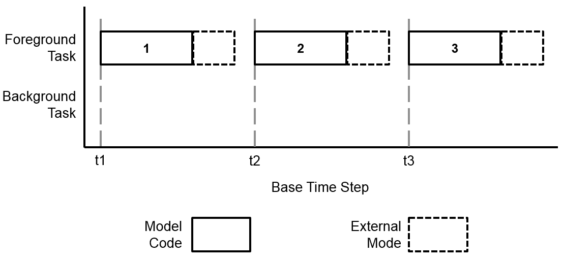 The communication service runs at each model base rate step, immediately after model code execution. This ensures all the data is logged. This diagram shows the typical execution of the external mode relative to the model code.
