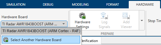 In the Hardware tab in Simulink Editor, select the same board from the list (click Select Another Hardware Board and select the supported board, if you are not using AWR1843BOOST). Ensure that you select the correct board in both