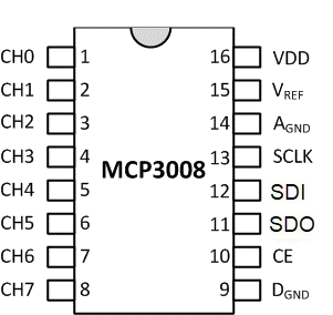 MCP3008 is a 10-bit, 8-channel analog to digital converter (ADC) with an SPI interface.