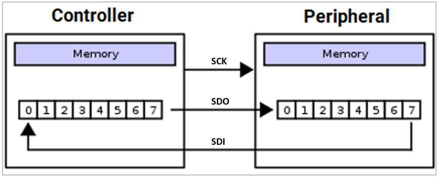 • As each SPI transfer is a full duplex transmission, the Controller sends a bit on SDO line and the peripheral device reads it. The peripheral device also sends a bit on the SDI line and the Controller reads it.