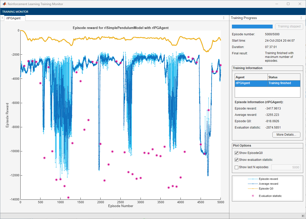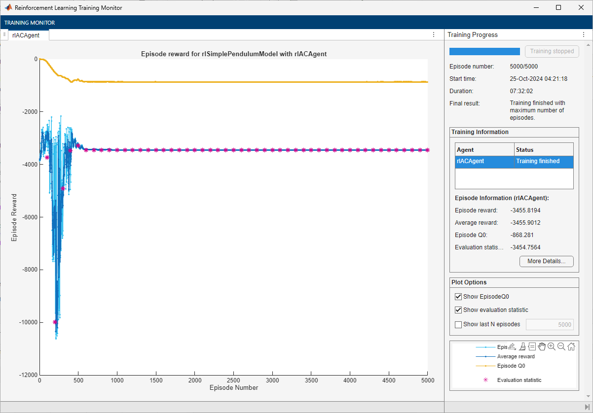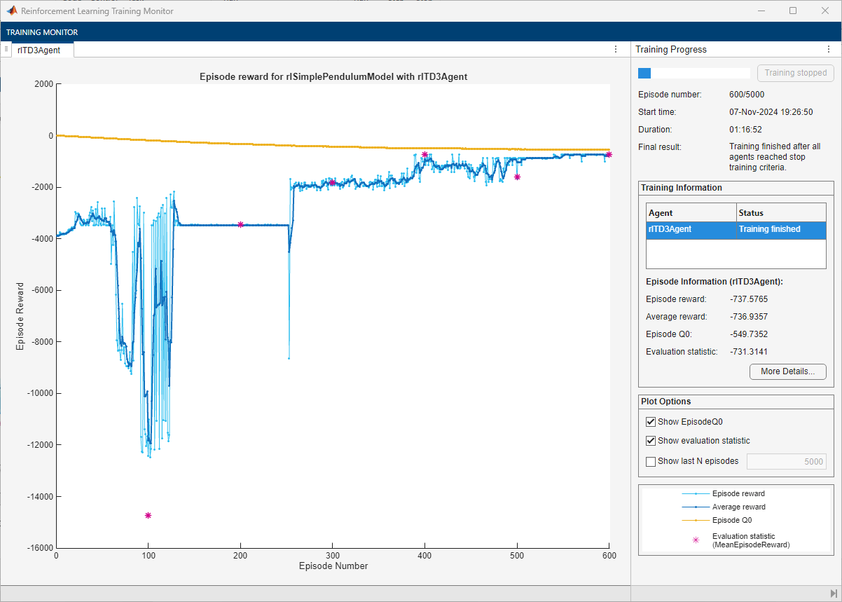 trainOpts = rlTrainingOptions(... MaxEpisodes=5000, ... MaxStepsPerEpisode=ceil(Tf/Ts), ... StopTrainingCriteria="EvaluationStatistic",... StopTrainingValue=-740);
