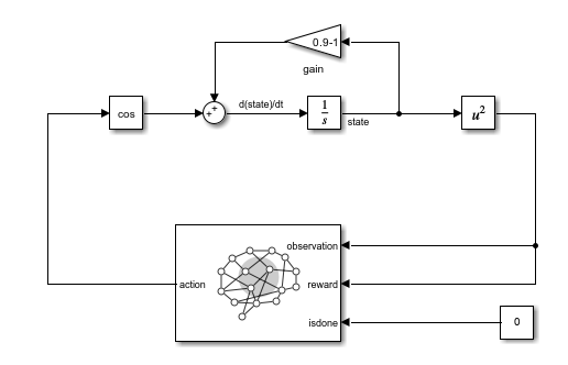 In the first model of this example, you fed the delayed NextObs output signal to the observation input port of the agent block. In this model, instead, the corresponding signal is the delayed output function (in this case, the square) of the NextState output signal. This signal is identical, from the agent perspective, to the output function of the current state signal, which is, in turn, exactly the current observation signal.