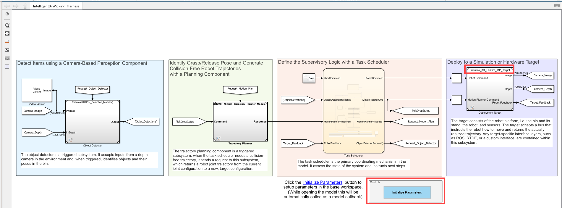 open_system("IntelligentBinPicking_Harness.slx")In the model, click Initialize Parameters to set up all required parameters for URSim. The updated model also displays the new target environment.