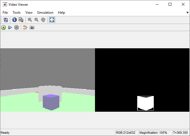 Video feed from the simulated vision sensor can be seen with a video viewer block as shown below.
