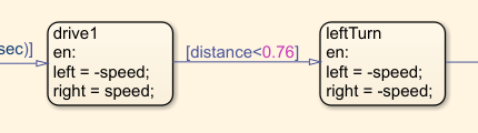 For example, the following transition initiates the robot to turn once it is at a distance of 0.76 m from the wall.
