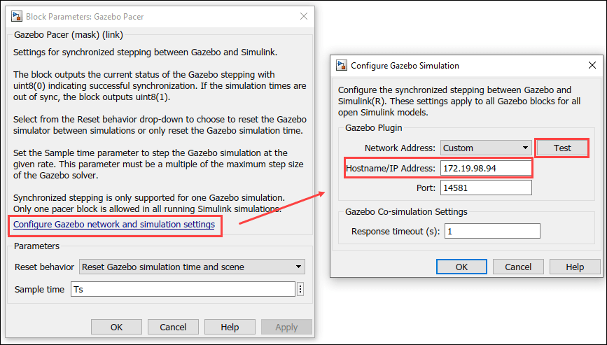 4. Click Test connection to verify the connection to Gazebo model. Click Ok and close the block dialog.