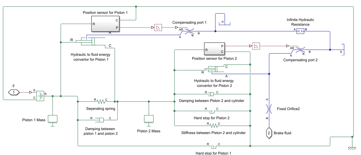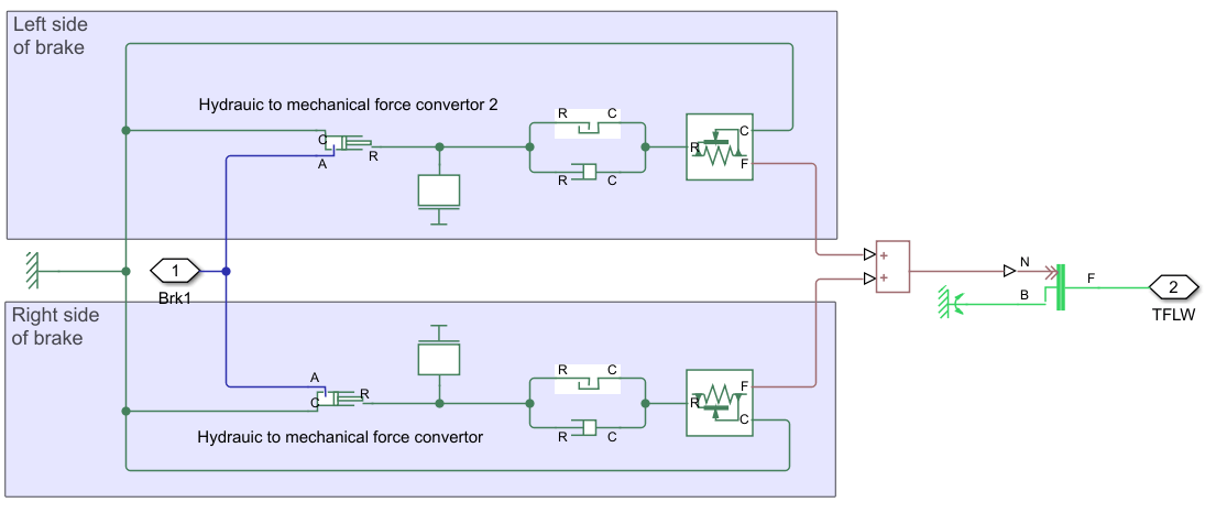 The friction braking component uses the system in the Fixed Caliper Disk Brake example. This brake consists of a Tandem Primary Cylinder (TPC) subsystem and a Fixed Caliper Disc Brake (FCDB) subsystem, each of which are shown below.