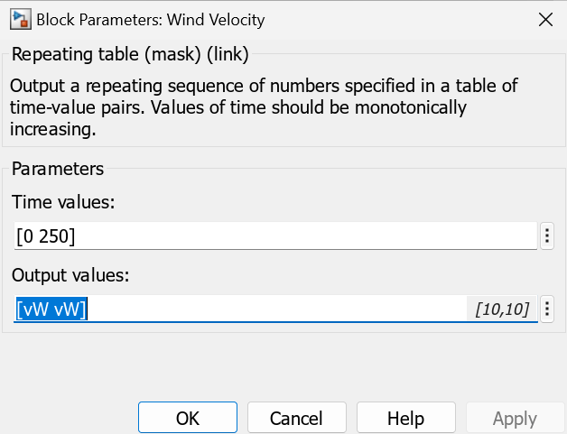 The initial model specifies the wind speed to 10 m/s. Double-click the Wind Velocity block.