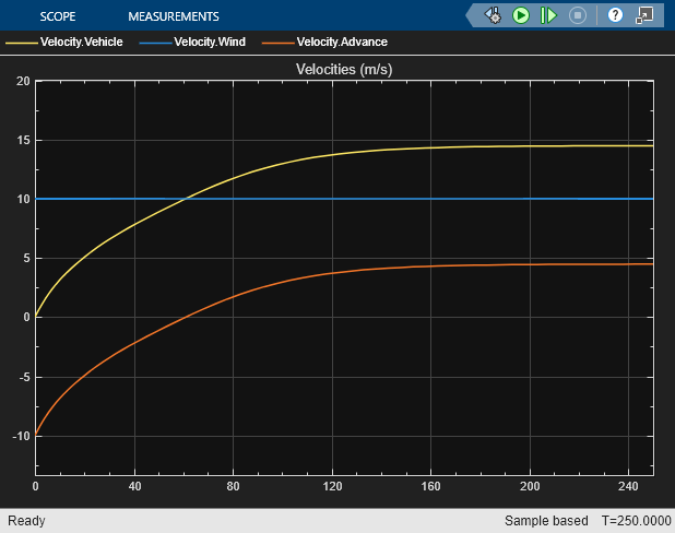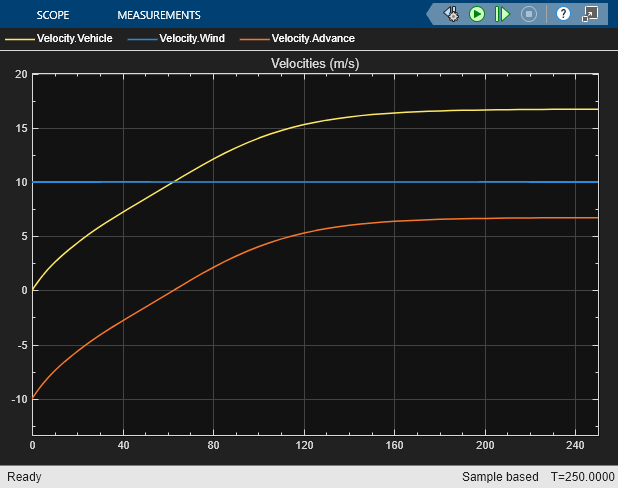 Run the model. The vehicle velocity exceeds the wind velocity at 63 seconds.