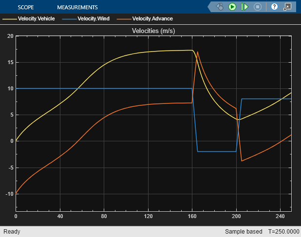 set_param("WindPoweredVehicleWithPropeller/Wind Velocity","rep_seq_t","[0 160 165 200 205 250.1]",... "rep_seq_y","[10 10 -2 -2 8 8]"); sim("WindPoweredVehicleWithPropeller"); open_system("WindPoweredVehicleWithPropeller/Scope");