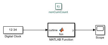 The Simulink Function block contains a Digital Clock block from the Simulink > Sources library. The Sample time parameter is set to -1 for inherited sample time. The MATLAB Function block within the Simulink Function block contains code that counts the number of noncumulative entities. Double-click the MATLAB Function block to view the code.