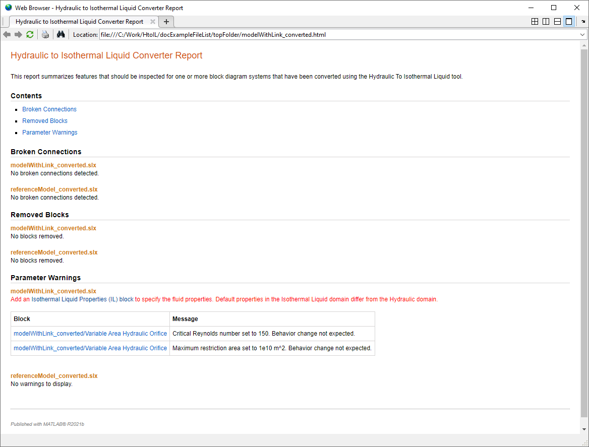 Die Bibliotheken für „Isothermal Liquid“-Blöcke sind ähnlich strukturiert wie andere fluidbezogene Domänen, z. B. „Thermal Liquid“, und häufig gibt es keine direkte Entsprechung zwischen den Blöcken der Bibliotheken „Isothermal Liquid“ und „Hydraulic“. Das Konvertierungstool führt alle während der Konvertierung aufgetretenen Probleme in einem HTML-Bericht auf, speichert sowohl den Bericht als auch das konvertierte Blockdiagrammsystem an dem von newpath festgelegten Speicherort und gibt den Namen des konvertierten Systems, newfile, zurück.