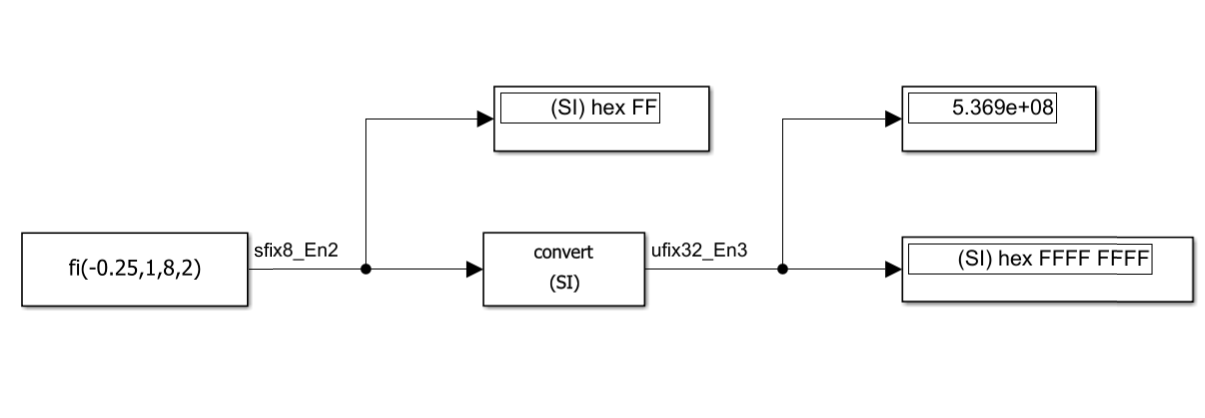 When you simulate the model, the value of the input signal is reinterpreted as a much larger value, and the value overflows from negative to positive. The bit pattern in the associated binary word is preserved by extending the sign bit and changing the scaling of the stored integer.
