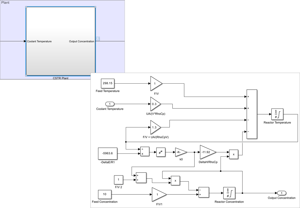 This example uses a nonlinear continuous stirred tank reactor (CSTR) model. The plant model uses the reactor coolant temperature as input and outputs the reactor concentration. The plant is represented using mathematical function blocks. For more information about the mathematical equations and schematic diagram of this model, see CSTR Model (Model Predictive Control Toolbox).