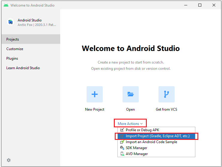 5. Open Android Studio and select More Actions > Import Project (Gradle, Eclipse, ADT, etc.).