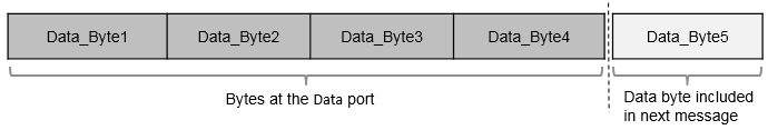 Suppose that the length of data received is 5 bytes. In this case, the Data port outputs a data vector of size 4. The vector contains only the first 4 bytes from the received data. The fifth byte is emitted along with the data bytes in the next time step. The Status port outputs 1.