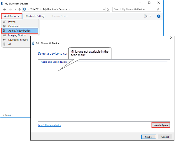 If the minidrone does not appear in the list, it indicates that the Bluetooth driver installation was not successful. In that case, install the driver again using the steps listed in Bluetooth Connection Fails.
